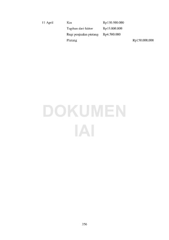 11 April Kas Rp130.500.000 Tagihan dari faktor Rp15.000.000 Rugi penjualan piutang Rp4.500.000 Piutang Rp150.000.000 DOKUMEN IAI 356