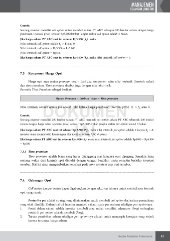 Jika harga saham PT ABC saat ini sebesar rp 5.500 (S ), maka nilai intrinsik put option adalah 0 karena S > E,